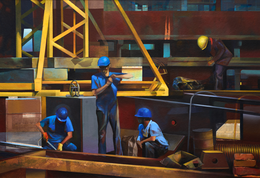 Za razliku od ranijih zamrznutih kompozicija, čiju statičnost i plitku iluziju dubine prostora manifestuje frontalnost motiva, na novim radovima poput Hemets I, Helmets II, Workers prostor je produbljen. Slika se usložnjava. Dijagonale aseptičnih mašina i mizanscena sugerišu mehaničku dinamiku, pokret, fragmentirani sinhronizovani rad na fabričkoj traci. Kolorit je arteficijalan, a tanki, lazurni nanosi boje, ispod kojih se mjestimično naziru platno i bojeni slojevi stvaraju sablasni osjećaj bestjelesnosti. Radnici postaju figure koje ravnopravno sa tehnicističkim ambijentom definišu prostor.