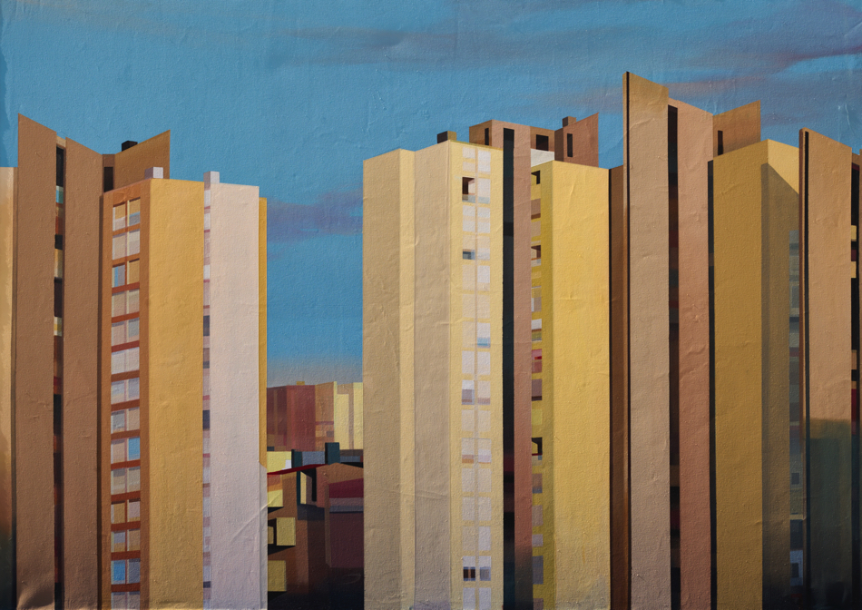 Depersonalizovanost i geometrijska repeticija ovih zgrada koje emituju atmosferu hladnoće i ne-mjesta su motivska polazišta u slikarstvu Lidije Nikčević. Za razumijevanje umjetničinog formalnog i poetskog pristupa ovom motivu treba imati u vidu da je Lidija rođena ranih 90-ih u postindustrijskom gradu Nikšiću čiji vizuelni identitet je dominantno oblikovala takva arhitektura. U protoku vremena, od izgradnje stambenih blokova 60-ih i 70-ih godina prošlog vijeka, do djetinjstva umjetnice i formativnih godina, fabrike su zatvorene, industrijski pejzaž je postao nijemi svjedok propadanja, a fasade stambenih zgrada su počele lagano i neumitno da se krune i da zadobijaju patinu i sraslost sa okolinom koje im je, paradoksalno, dala izvjesnu toplinu, humanost i nostalgičnu ljepotu.