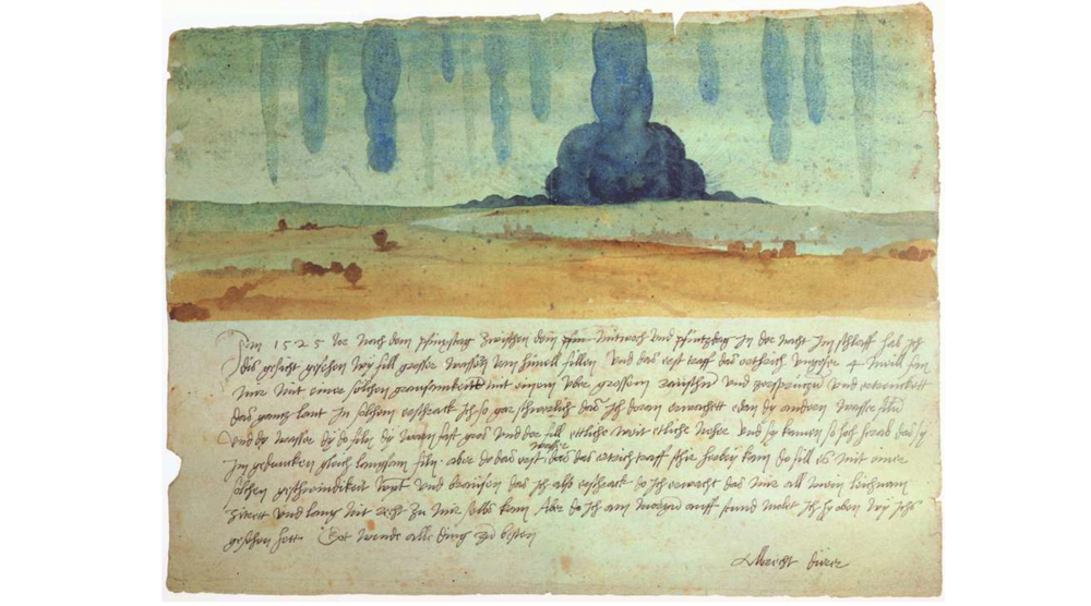 Ali prva voda koja je tako iznenada pala na zemlju, pala je takvom brzinom, praćena vjetrom i tako zastrašujućom hukom, da mi je, kada sam se probudio, cijelo tijelo zadrhtalo i dugo nisam mogao da se oporavim. Kada sam ustao ujutru, naslikao sam gore kako sam ga vidio. Neka Gospod sve okrene nabolje."